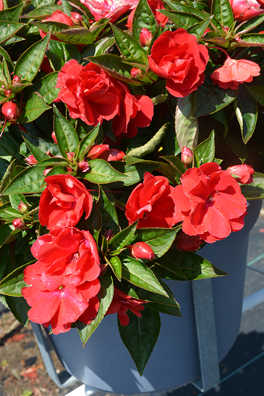 Wild Romance Red New Guinea Impatiens features bold red round flowers at the ends of the stems from mid spring to early fall. Its pointy leaves remain dark green in colour throughout the season.