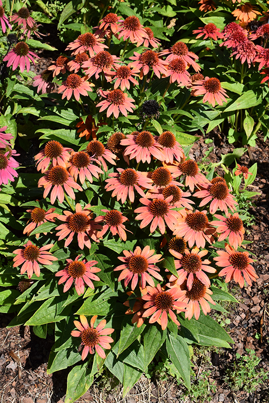 Sombrero® Fiesta Orange Coneflower will grow to be about 18 inches tall at maturity extending to 24 inches tall with the flowers, with a spread of 18 inches. Its foliage tends to remain dense right to the ground, not requiring facer plants in front. It grows at a medium rate, and under ideal conditions can be expected to live for approximately 10 years. As an herbaceous perennial, this plant will usually die back to the crown each winter, and will regrow from the base each spring. Be careful not to disturb the crown in late winter when it may not be readily seen!