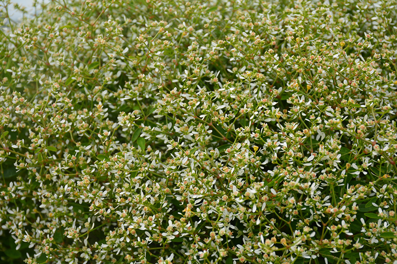 Mounded perennial has beautiful, rich green foliage, contrasting the airy, abundant white flowers that are non-stop from spring to fall; adapts to varied soils, deer tend to stay away; milky sap can be a skin irritant to humans