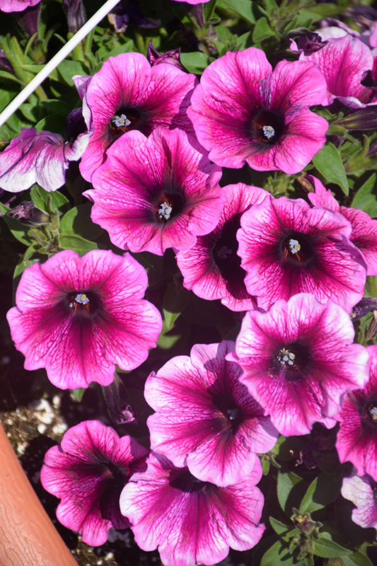 Fortunia Early Grape Vein Petunia is bathed in stunning fuchsia trumpet-shaped flowers with plum purple veins at the ends of the stems from mid spring to late summer. Its pointy leaves remain green in colour throughout the season.