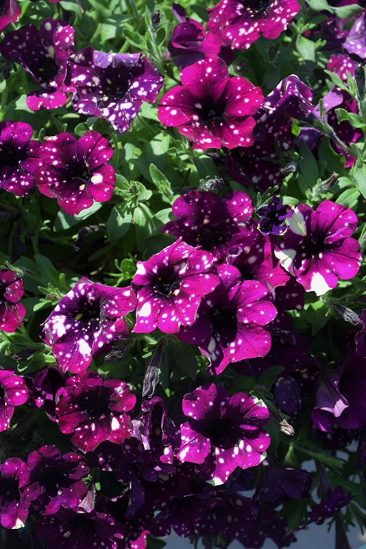A unique and stunning, early flowering series with a mounded habit, ideal for hanging baskets, patio containers and garden landscapes; large, brightly colored blooms with speckled pattern, holding up to the summer heat; deadhead to encourage growth