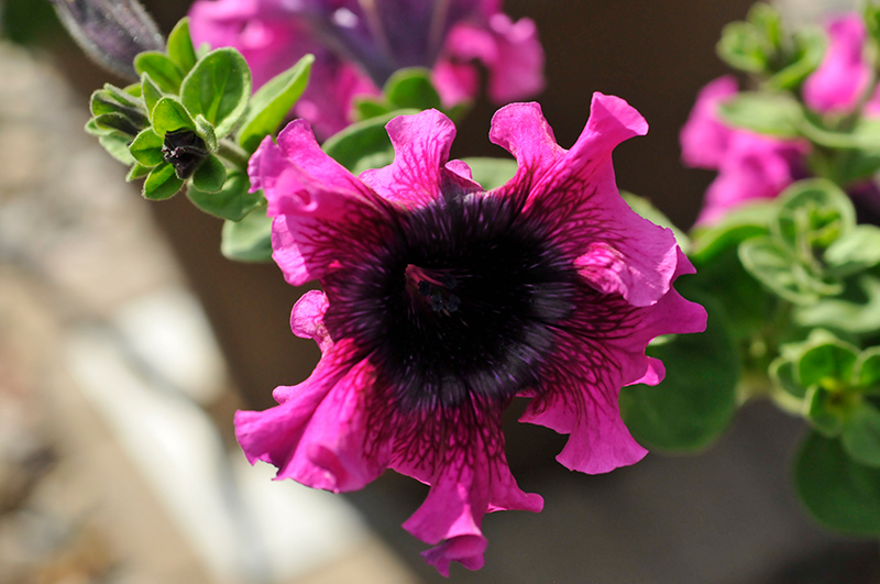 A unique variety that features beautiful, extra large, dark magenta ruffled blooms with dark purple veiny throats; mounded habit with slight cascading habit, ideal for containers, hanging baskets and window boxes