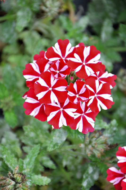 Samira Deep Red Star Verbena features showy clusters of red star-shaped flowers with white stripes at the ends of the stems from late spring to mid fall. The flowers are excellent for cutting. Its tiny pointy leaves remain green in colour throughout the season.