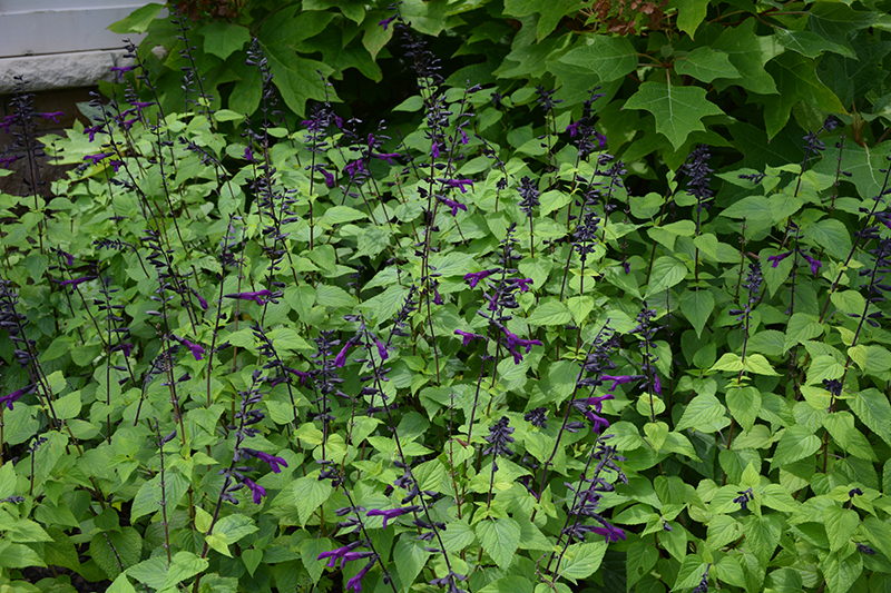 Bodacious® Smokey Jazz Sage features showy spikes of violet flowers with purple overtones and black calyces rising above the foliage from late spring to mid fall. Its fragrant pointy leaves remain dark green in colour throughout the season. The black stems are very colorful and add to the overall interest of the plant.