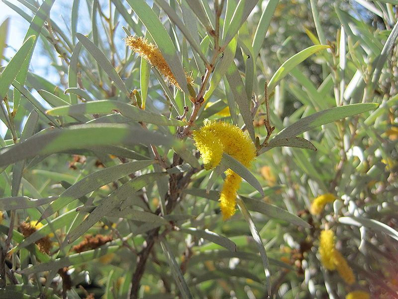 Mulga features showy yellow catkins along the branches from early spring to mid fall. It has attractive grayish green foliage with hints of silver. The narrow leaves are highly ornamental and remain grayish green throughout the winter. The fruits are showy tan pods displayed from mid summer to early winter. The fruit can be messy if allowed to drop on the lawn or walkways, and may require occasional clean-up. The smooth gray bark and brick red branches add an interesting dimension to the landscape.