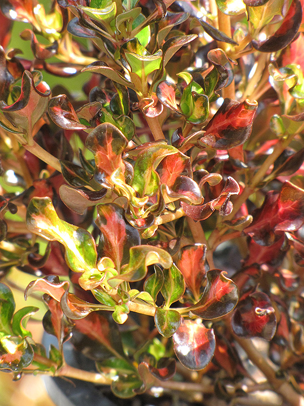 This stunning variegated cultivar produces wavy foliage with bright red-orange centers and deep burgundy edges, on a dense, compact habit; best in part sun and light shade, or full sun on the coast; fairly drought tolerant once established