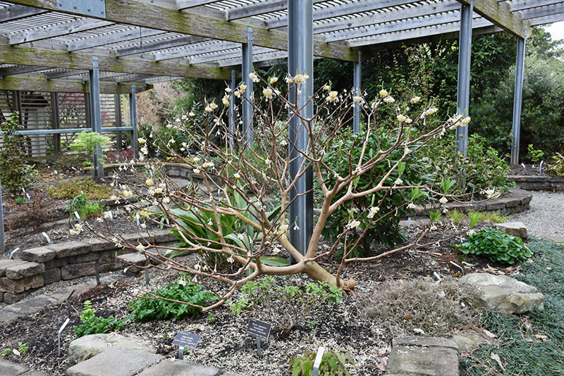 Snow Globe Hybrid Japanese Paper Bush has masses of beautiful clusters of fragrant gold trumpet-shaped flowers with white overtones and orange throats at the ends of the branches from mid winter to early spring before the leaves, which are most effective when planted in groupings. It has attractive dark green deciduous foliage. The small narrow leaves are highly ornamental but do not develop any appreciable fall colour. The tan bark adds an interesting dimension to the landscape.