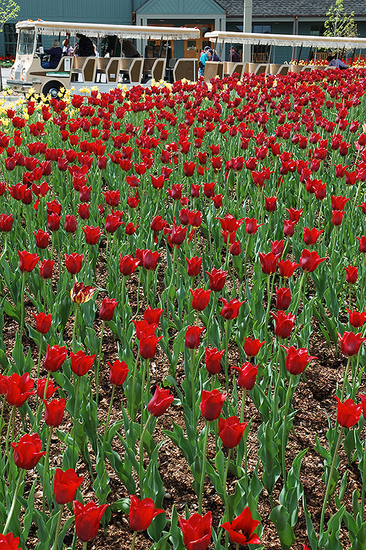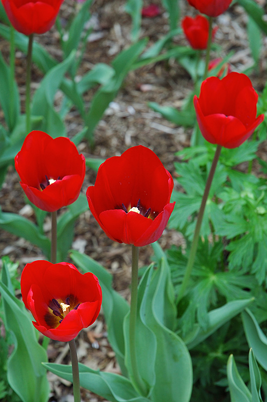 Bastogne Tulip is an herbaceous perennial with tall flower stalks held atop a low mound of foliage. Its medium texture blends into the garden, but can always be balanced by a couple of finer or coarser plants for an effective composition.