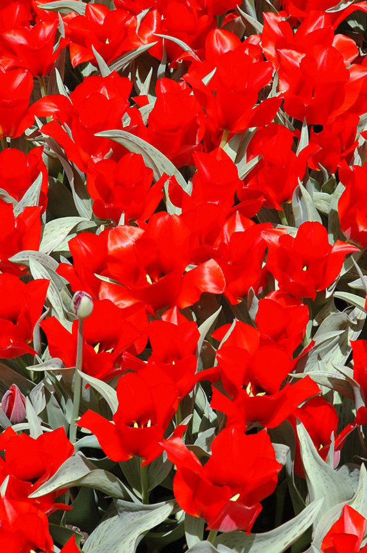 Casa Grande Tulip has masses of beautiful red cup-shaped flowers with black eyes and yellow anthers at the ends of the stems in early spring, which are most effective when planted in groupings. The flowers are excellent for cutting. Its attractive sword-like leaves remain bluish-green in colour with distinctive deep purple spots throughout the season.