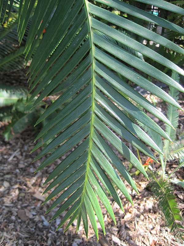 Mejia's Dioon is primarily grown for its highly ornamental fruit. The creamy white fruits which fade to tan over time are held in abundance in spectacular cones from late fall to late winter. Its attractive large narrow pinnately compound leaves emerge light green in spring, turning bluish-green in colour with hints of steel blue the rest of the year. The dark brown stems can be quite attractive.