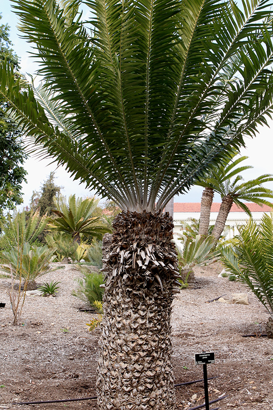 A fast and easy to grow, medium sized cycad with long, green leaves that emerge upright, then relax outward; develops a stout trunk over a long period; an attractive landscape accent; water tolerant, but must be well drained