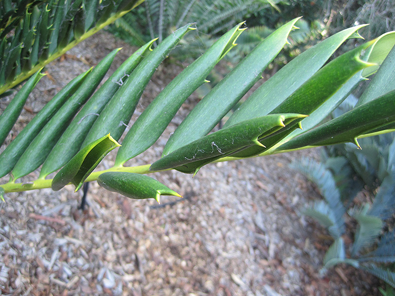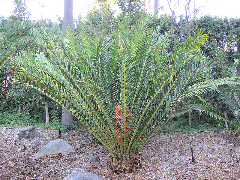 A vigorous, easy to grow, medium to large sized cycad with long, green leaves that emerge upright, then relax outward; develops a stout trunk over a long period; needs sun protection in hot desert areas; water tolerant, but must be well drained