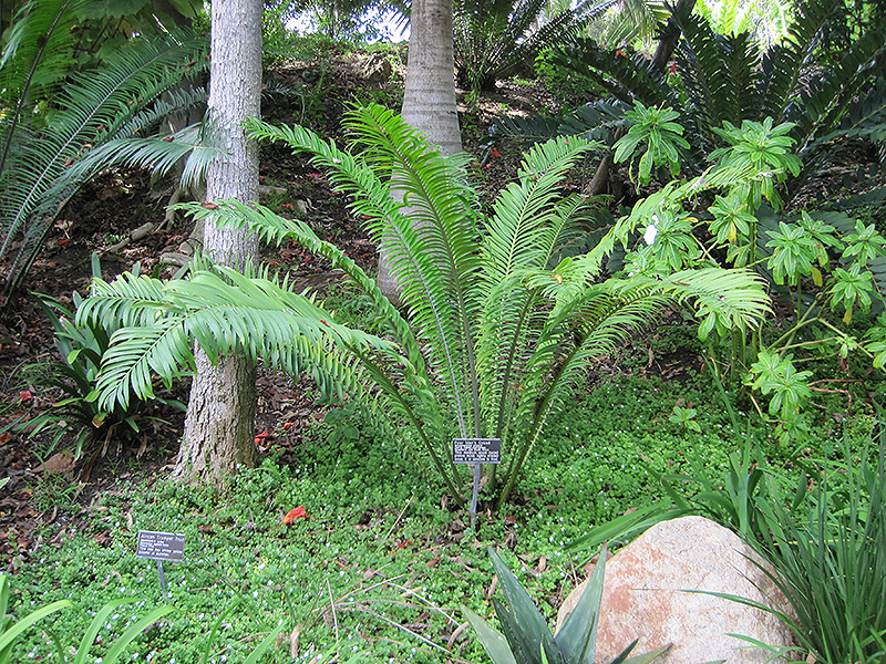 A fast and easy to grow, medium sized cycad with long, green leaves that emerge upright, then relax outward from an underground stem; an attractive landscape accent; adaptable and water tolerant, but must be well drained