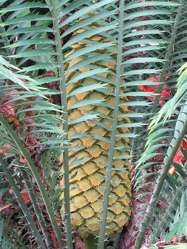 Poor Man's Cycad is primarily grown for its highly ornamental fruit. The gold fruits with grayish green overtones are held in abundance in spectacular cones from early spring to mid fall. It has attractive bluish-green foliage with hints of powder blue. The large glossy narrow pinnately compound leaves are highly ornamental and remain bluish-green throughout the winter.