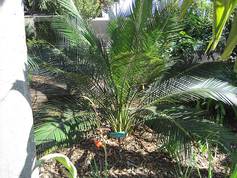 A medium sized cycad with a woody trunk that is typically underground, unless on a shallow, rocky site; long, arching pinnate leaves are graceful in form and texture; may produce female cones with red to orange seeds; watch for mealybugs and scale
