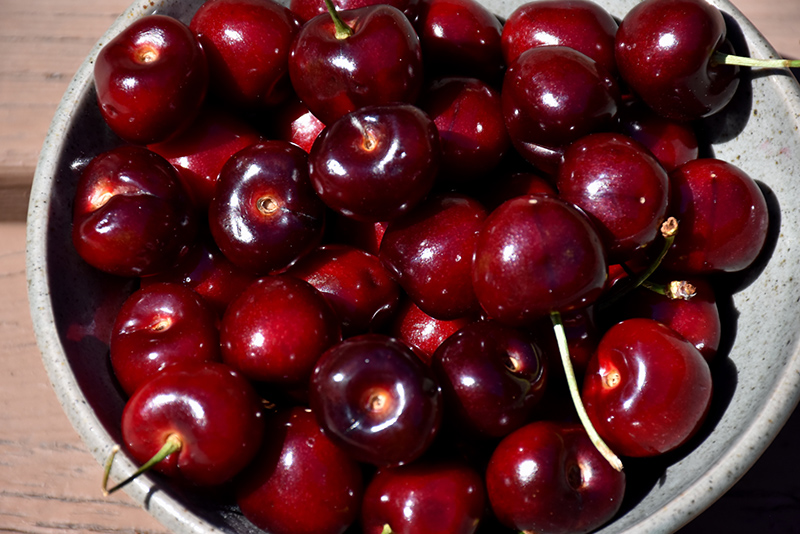 A semi-dwarf, hardy, and crack resistant selection, featuring showy white flowers in spring followed by sweet, deep red-black cherries for fresh eating; needs full sun, well drained soil; self-pollinating, and a good pollinator for other sweet cherries