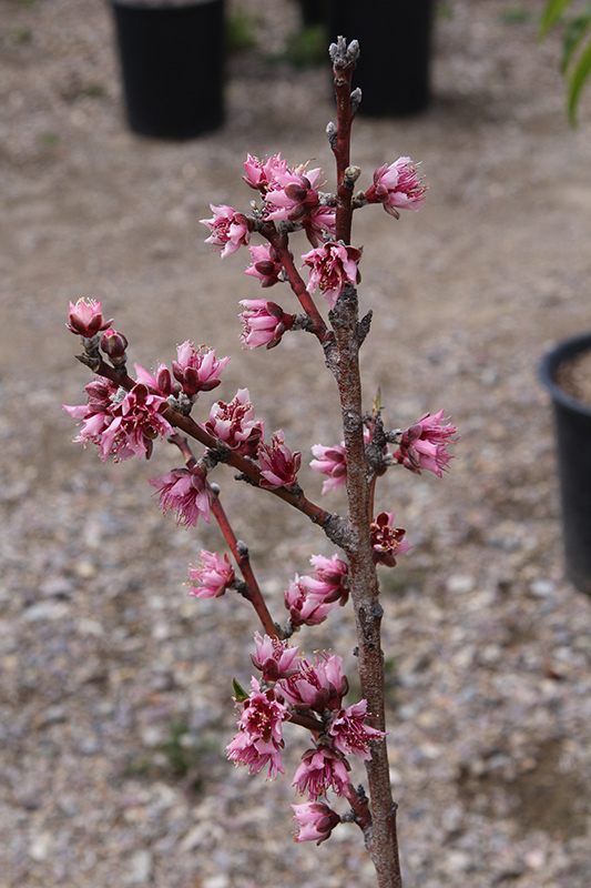 Bonita Peach is clothed in stunning clusters of fragrant pink flowers along the branches in early spring, which emerge from distinctive rose flower buds before the leaves. It has dark green deciduous foliage. The narrow leaves turn yellow in fall. The fruits are showy yellow drupes with a red blush, which are carried in abundance in mid summer. The fruit can be messy if allowed to drop on the lawn or walkways, and may require occasional clean-up.