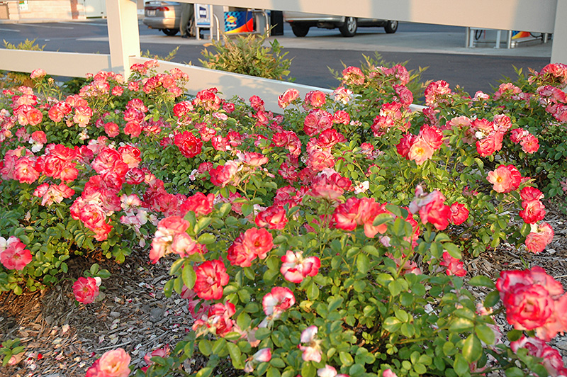 Masses of orange-red blossoms flecked with peach and cream are presented on this true easy care groundcover rose; simple to grow and easy to maintain, with no spraying; cut back to one third in late winter