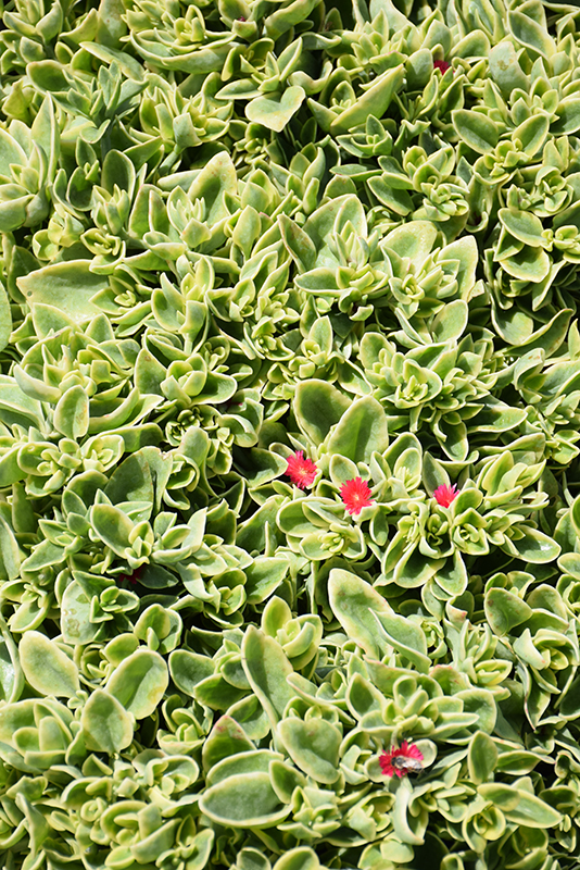 This succulent groundcover plant produces bright magenta-red flowers over cream edged, green foliage in summer; blooms only open in mid-day sun; an interesting plant to include in a rockery, or a combination planter; used for soil retention as well