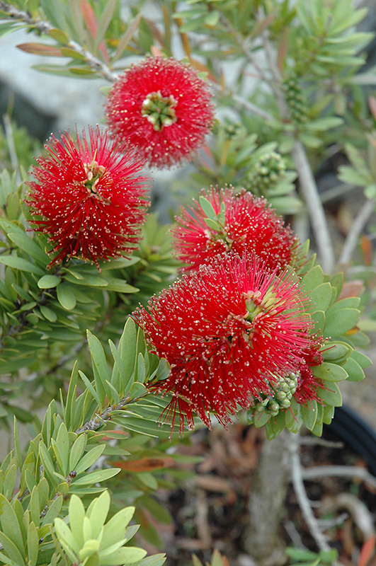 An outstanding selection, presenting arching branches of attractive, lance shaped foliage; intense crimson red bottlebrush blooms are quite large and bloom throughout the summer, sporadically thereafter; can be maintained as a small tree, or a hedge