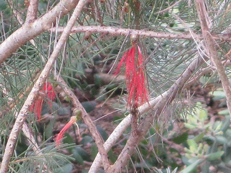 Identified by its very narrow, needle-like leaves, this distinctive selection features either lime-green or coral red bottlebrush blooms in spring and summer; may be low and spreading or upright and open; keep tidy with regular pruning