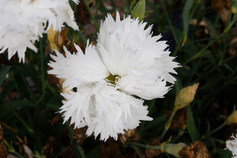 Elegance White Pinks is smothered in stunning lightly-scented double white frilly flowers at the ends of the stems from late spring to early fall. The flowers are excellent for cutting. Its attractive narrow leaves emerge light green in spring, turning grayish green in colour the rest of the year.
