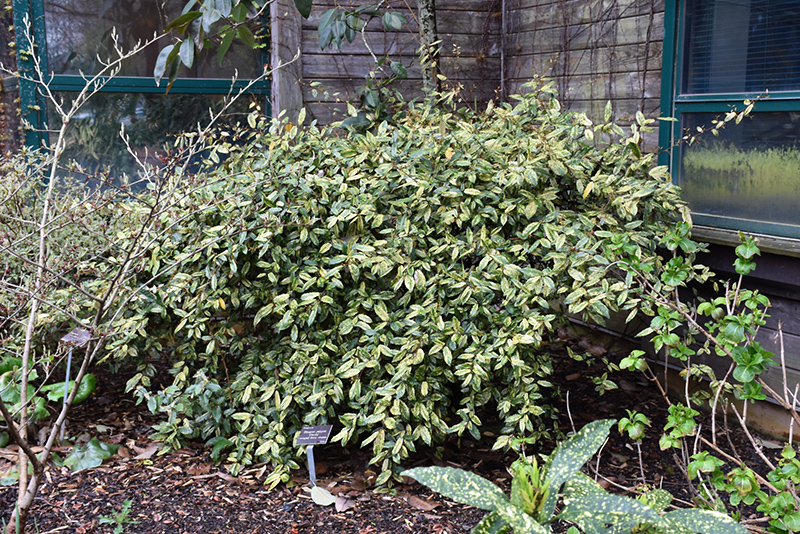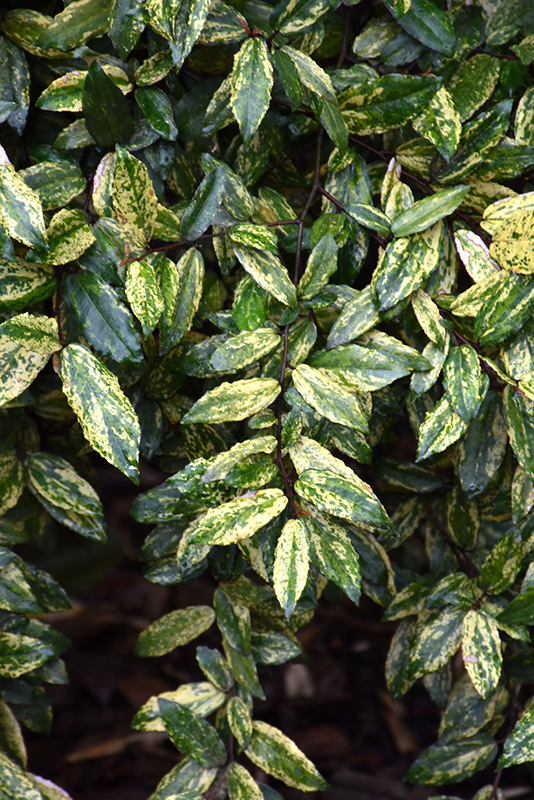 Chirifu Variegated Silverberry has attractive gold-spotted forest green foliage with hints of buttery yellow on a plant with a mounded habit of growth. The glossy oval leaves are highly ornamental and remain forest green throughout the winter. It features subtle clusters of fragrant silver bell-shaped flowers with white overtones along the branches in early fall.
