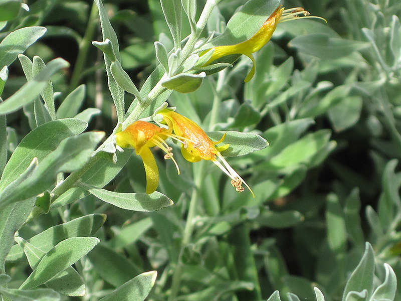 Tar Bush is draped in stunning yellow tubular flowers with orange overtones along the branches from early fall to late spring. It has attractive grayish green foliage with hints of silver. The small fuzzy oval leaves are highly ornamental and remain grayish green throughout the winter.