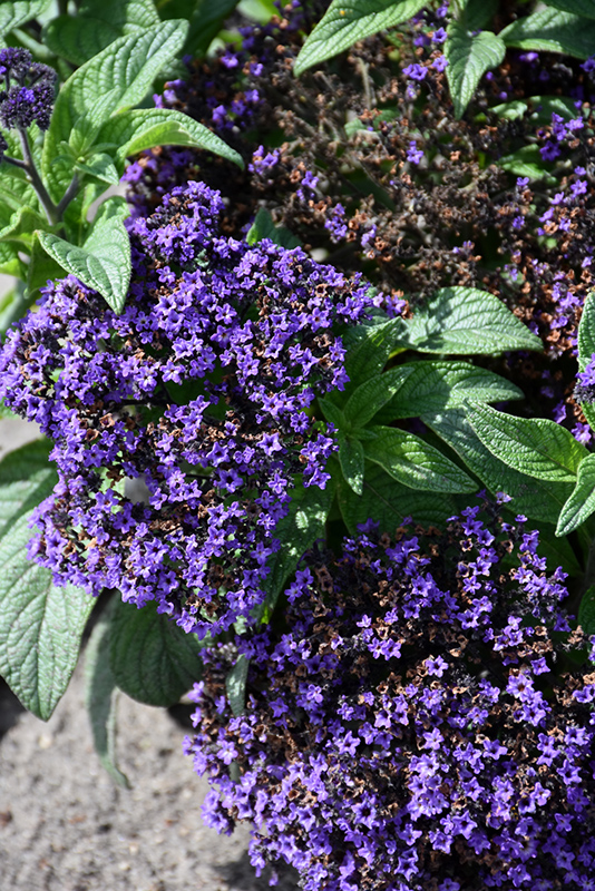 Mini Marine Heliotrope has masses of beautiful clusters of fragrant deep purple flowers at the ends of the stems from late spring to early fall, which are most effective when planted in groupings. Its textured pointy leaves remain green in colour throughout the season.