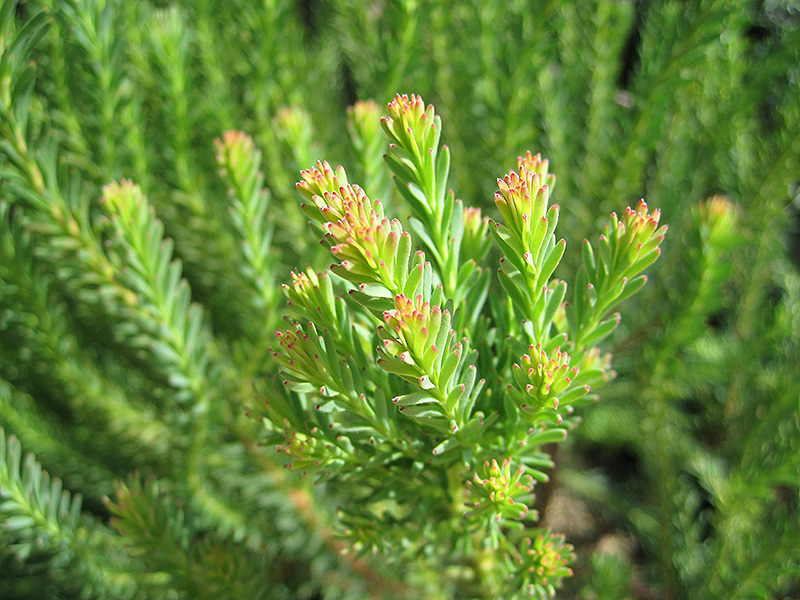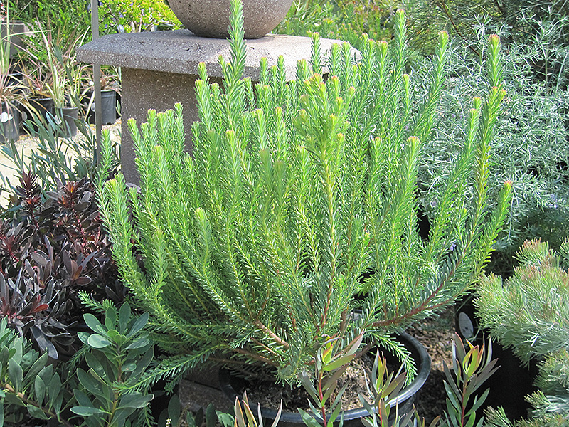This flowering shrub, in the Protea family, features pale yellow flower heads in spring followed by attractive silver cones; abundant stems are covered with tiny, needle-like leaves that are tipped red when young; avoid phosphorus fertilizers
