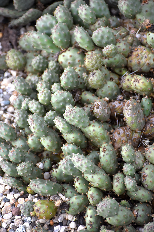 Brittle Prickly Pear Cactus is a tiny succulent evergreen plant with a spreading habit of growth that trails along the ground. It eventually becomes a spreading shrub-like plant with multiple 'branches' and stems. As a type of cactus, it has no true foliage; the body of the plant is wholly comprised of a linked series of spiny green pads which are connected together to form the branches of the plant.