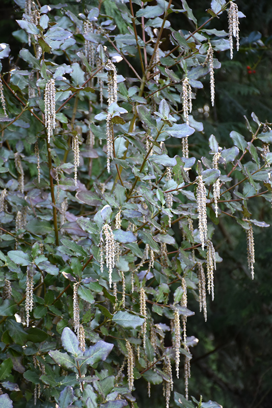 This variety is an upright, evergreen shrub with glossy, leathery, green oval leaves with wavy margins; selected for its superior disease resistance; gracefully draped ivory catkins appear in spring, and will persist on this bush through the summer