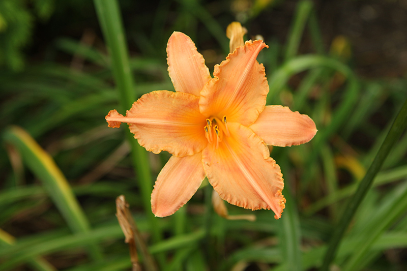 Mango Thrills Daylily features bold peach trumpet-shaped flowers with orange overtones and chartreuse throats at the ends of the stems from early to mid summer. The flowers are excellent for cutting. Its grassy leaves remain green in colour throughout the season.