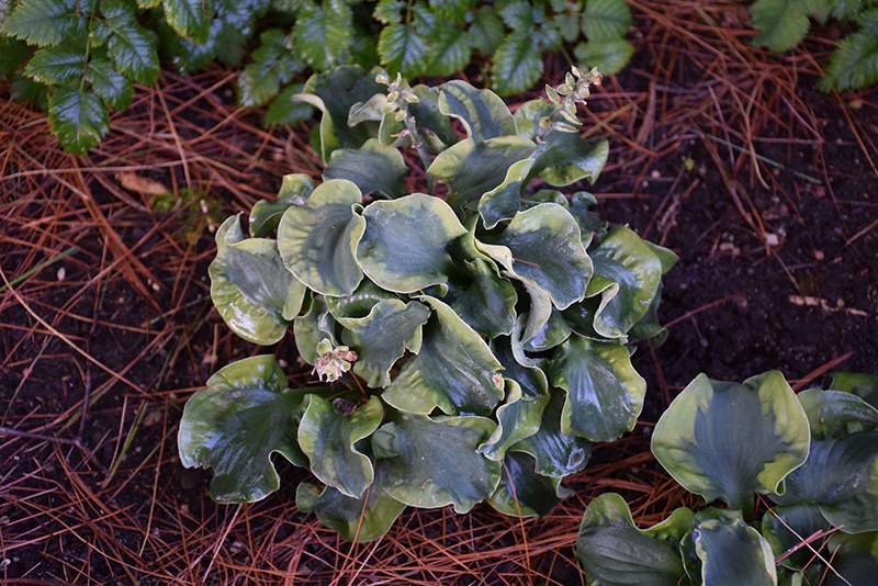 This miniature mounded hosta features intensely wavy, blue-green to green leaves with creamy yellow margins; dainty spikes of pale lavender flowers in early to mid-summer; great for containers or edging
