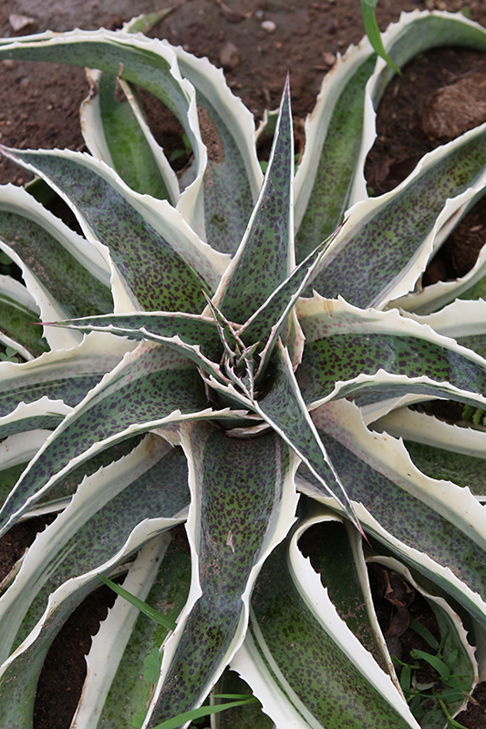This attractive selection produces a rosette of thick blue-green succulent leaves that cascade downward, with pronounced spotting and creamy white, toothed margins; grown primarily for foliage; a great low-maintenance patio plant; must have good drainage