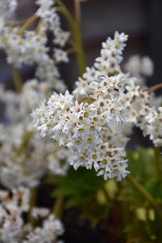 A woodland treasure that forms a low round mound of large, rounded, lobed leaves that mature to deep green, becoming tinged with bronze; lovely spikes of dainty white flowers tower above the mounded foliage in spring; excellent for containers or edging