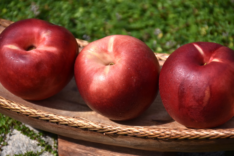 A semi-dwarf cultivar, featuring rich red fruits with sweetly flavored, juicy snow white flesh; freestone; stunning pink flowers in spring on a low, spreading habit; susceptible to late spring freezes and disease, needs full sun and well-drained soil