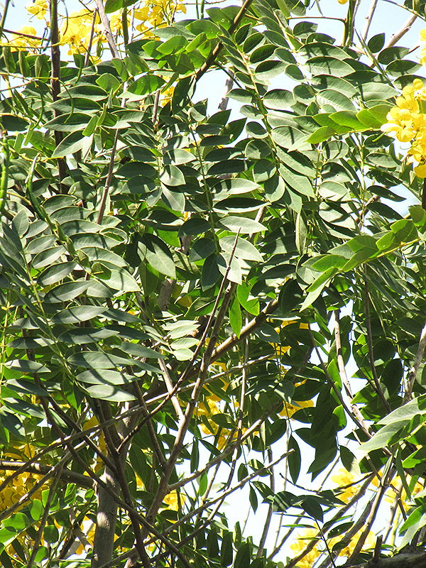 Whitebark Senna features showy racemes of yellow cup-shaped flowers rising above the foliage from late winter to late fall. It has attractive dark green foliage with grayish green undersides. The oval compound leaves are highly ornamental but do not develop any appreciable fall colour. The fruits are showy green pods displayed in mid spring. The fruit can be messy if allowed to drop on the lawn or walkways, and may require occasional clean-up. The warty gray bark adds an interesting dimension to the landscape.