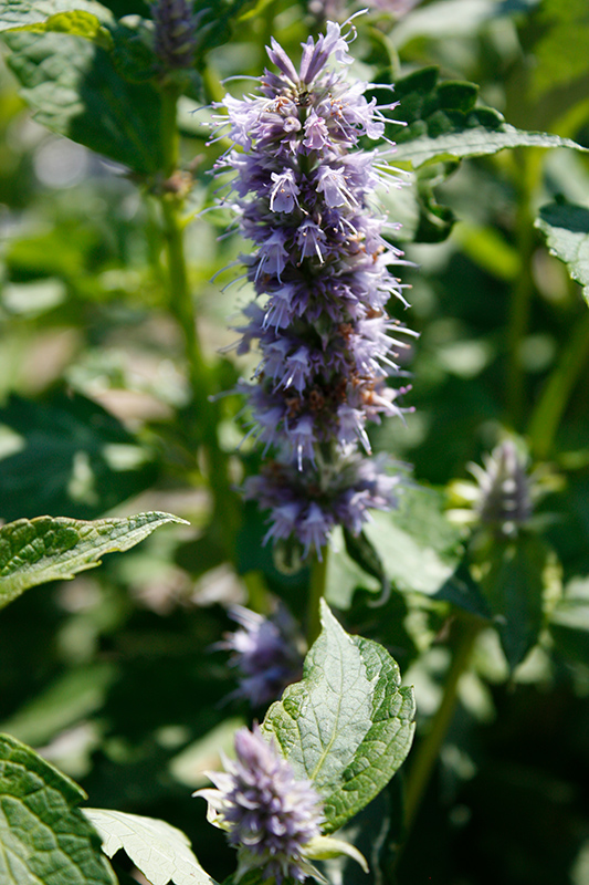 Crazy Fortune Anise Hyssop has masses of beautiful spikes of lightly-scented purple flowers with lavender overtones rising above the foliage from early summer to early fall, which are most effective when planted in groupings. The flowers are excellent for cutting. Its attractive fragrant pointy leaves remain dark green in colour with showy white variegation throughout the season.