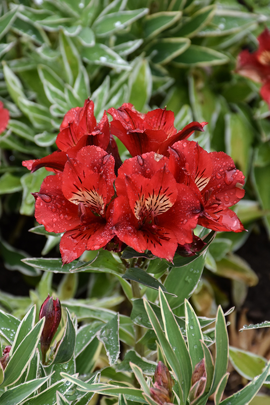 This impressive selection presents stunning deep red blooms, with cream blotches and burgundy spots; attractive, mounded green foliage with white edges provides contrast; blooms last well as cut flowers