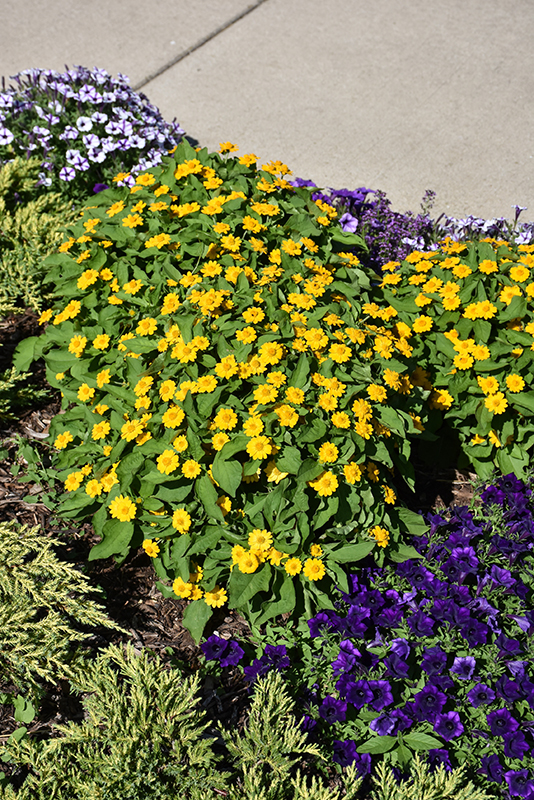 A compact and floriferous cultivar of this easy to grow annual; features golden yellow blooms cover compact mounds throughout the season with no need to deadhead spent blooms; tolerant of some shade and very tolerant of heat