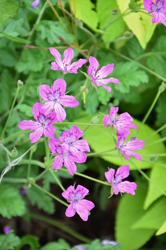 Manescau Heron's Bill has masses of beautiful clusters of hot pink star-shaped flowers with white eyes and purple veins rising above the foliage from late spring to late summer, which are most effective when planted in groupings. Its attractive tomentose ferny pinnately compound leaves remain green in colour throughout the season.