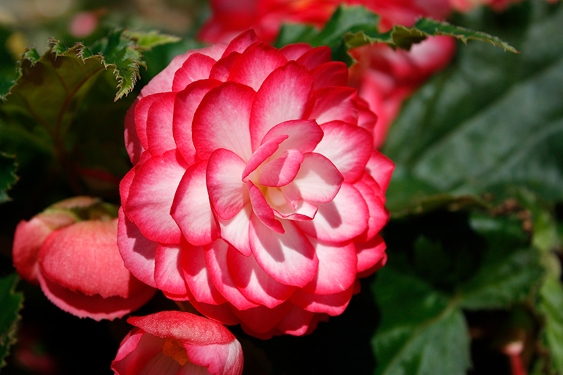 Nonstop® Joy Rose Picotee Begonia features dainty double white frilly flowers with rose edges at the ends of the stems from mid spring to mid fall. Its succulent heart-shaped leaves remain green in colour throughout the season.