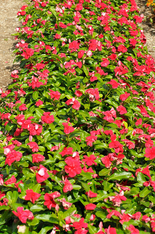 Mega Bloom® Dark Red Vinca will grow to be about 14 inches tall at maturity, with a spread of 16 inches. When grown in masses or used as a bedding plant, individual plants should be spaced approximately 14 inches apart. Its foliage tends to remain dense right to the ground, not requiring facer plants in front. Although it's not a true annual, this fast-growing plant can be expected to behave as an annual in our climate if left outdoors over the winter, usually needing replacement the following year. As such, gardeners should take into consideration that it will perform differently than it would in its native habitat.