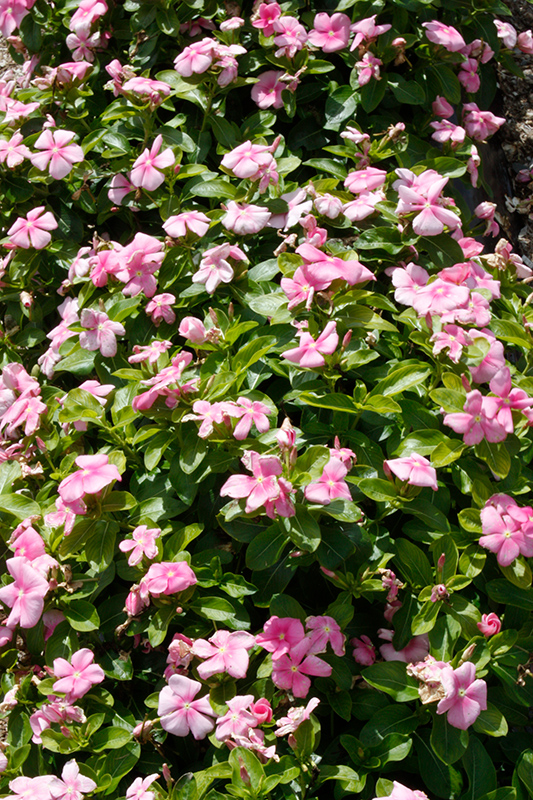 Pacifica XP Icy Pink Vinca features showy shell pink round flowers at the ends of the stems from late spring to mid fall. Its glossy oval leaves remain dark green in colour throughout the year.