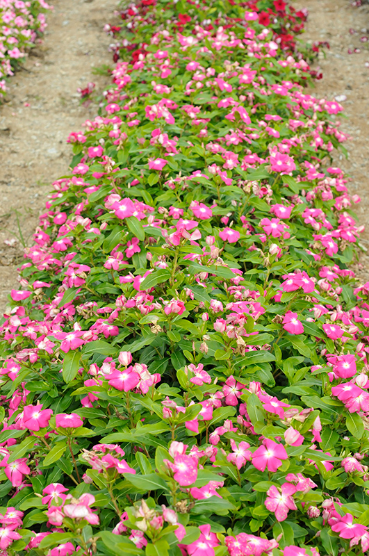 Pacifica XP Rose Halo Vinca will grow to be about 10 inches tall at maturity, with a spread of 8 inches. When grown in masses or used as a bedding plant, individual plants should be spaced approximately 6 inches apart. Its foliage tends to remain low and dense right to the ground. Although it's not a true annual, this fast-growing plant can be expected to behave as an annual in our climate if left outdoors over the winter, usually needing replacement the following year. As such, gardeners should take into consideration that it will perform differently than it would in its native habitat.