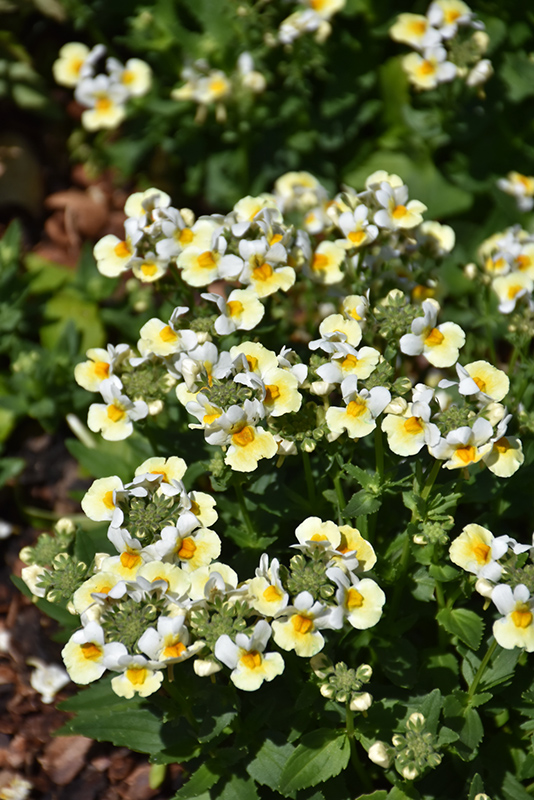 Momento Yellow Nemesia features dainty lightly-scented buttery yellow pea-like flowers with white overtones and yellow eyes at the ends of the stems from mid spring to early fall. Its small pointy leaves remain dark green in colour throughout the season.