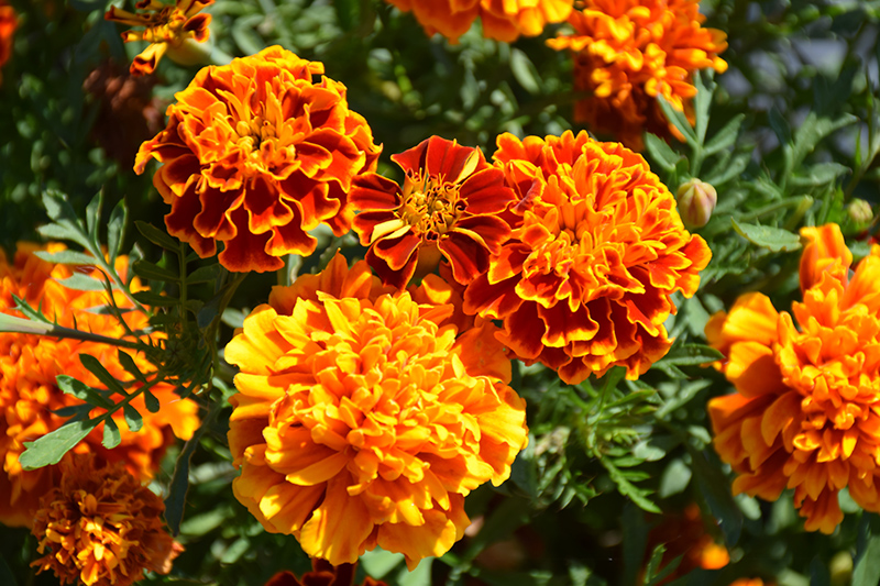 Super Hero™ Orange Flame Marigold features bold double orange pincushion flowers with scarlet overtones and yellow tips at the ends of the stems from late spring to mid fall. The flowers are excellent for cutting. Its fragrant ferny leaves remain dark green in colour throughout the season.