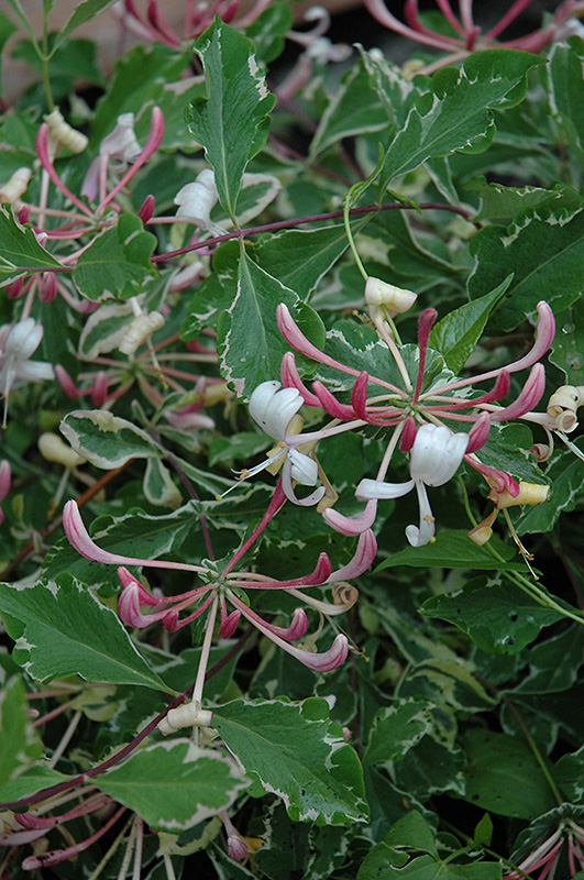 Harlequin Honeysuckle will grow to be about 20 feet tall at maturity, with a spread of 24 inches. As a climbing vine, it tends to be leggy near the base and should be underplanted with low-growing facer plants. It should be planted near a fence, trellis or other landscape structure where it can be trained to grow upwards on it, or allowed to trail off a retaining wall or slope. It grows at a fast rate, and under ideal conditions can be expected to live for approximately 20 years.