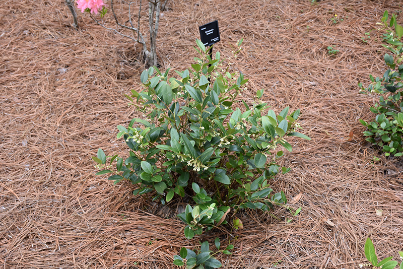 A compact shrub featuring rich, thick, dark green foliage on arching branches; pretty racemes of urn-shaped, fragrant white flowers in spring, compliment the interesting foliage; flowers well, and is best in part-shade; very resistant to leaf spot disease